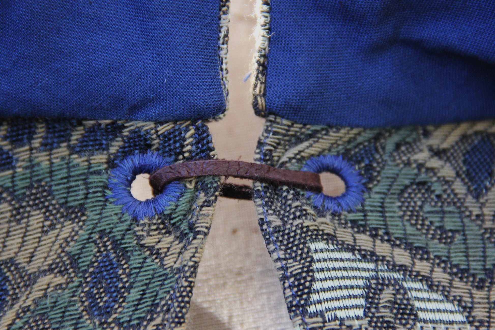 Made with a tapestry-like weave, this cloak is warm and soft, decorated in crests and flourishes reminiscent of medieval heraldry patterns. The pattern is very nearly matched down the center front (a very fortunate accident), and is framed by a rounded collar inspired by a statue from the period. Both the cloak and the collar are lined in a soft, dense royal blue cotton. It has a pair of re-enforced eyelets as a closure. It is a full 3/4 circle, laying closed more comfortably than semicircle cloaks. Perfect for those wanting to look sharp for a joust or a warm layer for a breezy walk in the palace gardens.