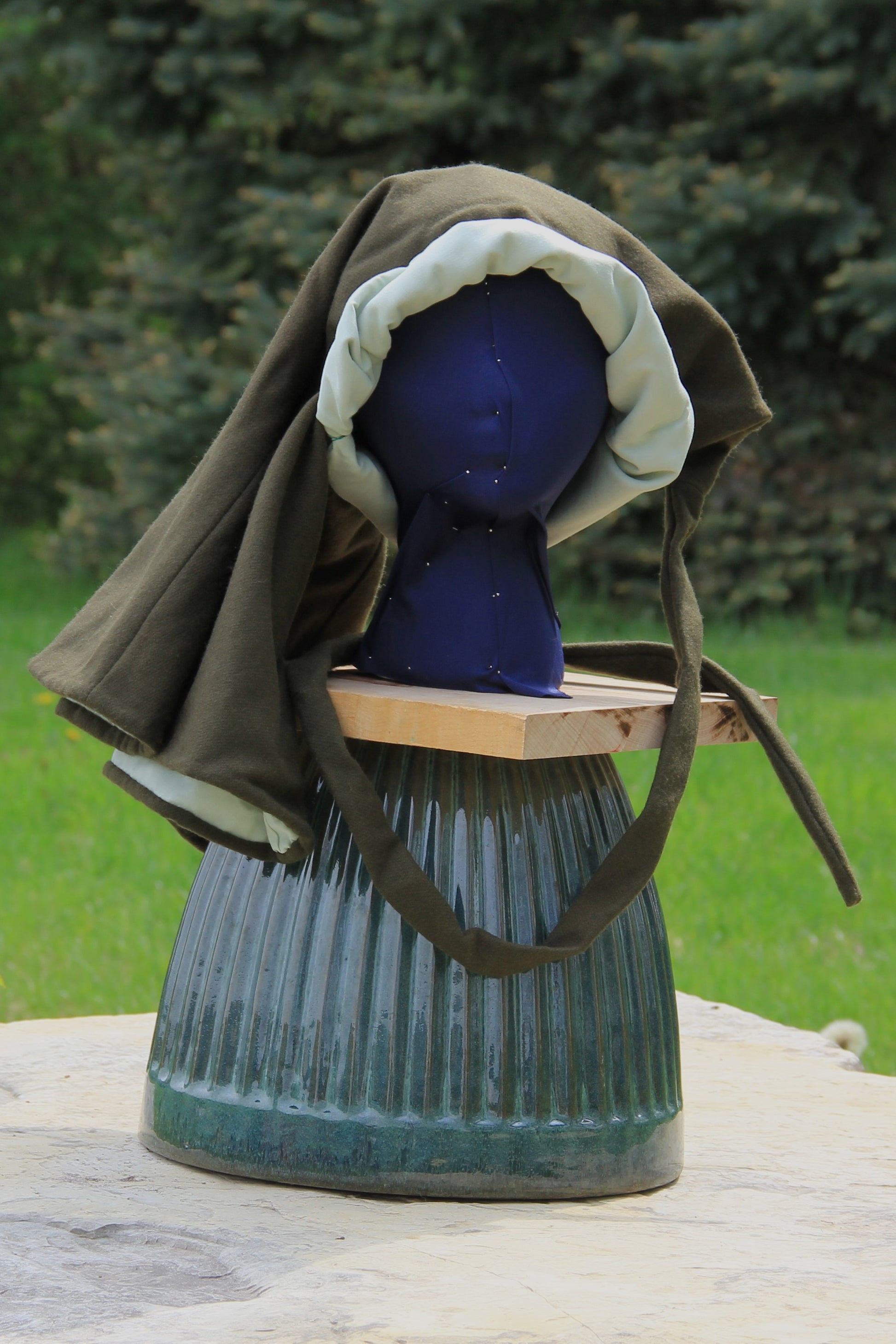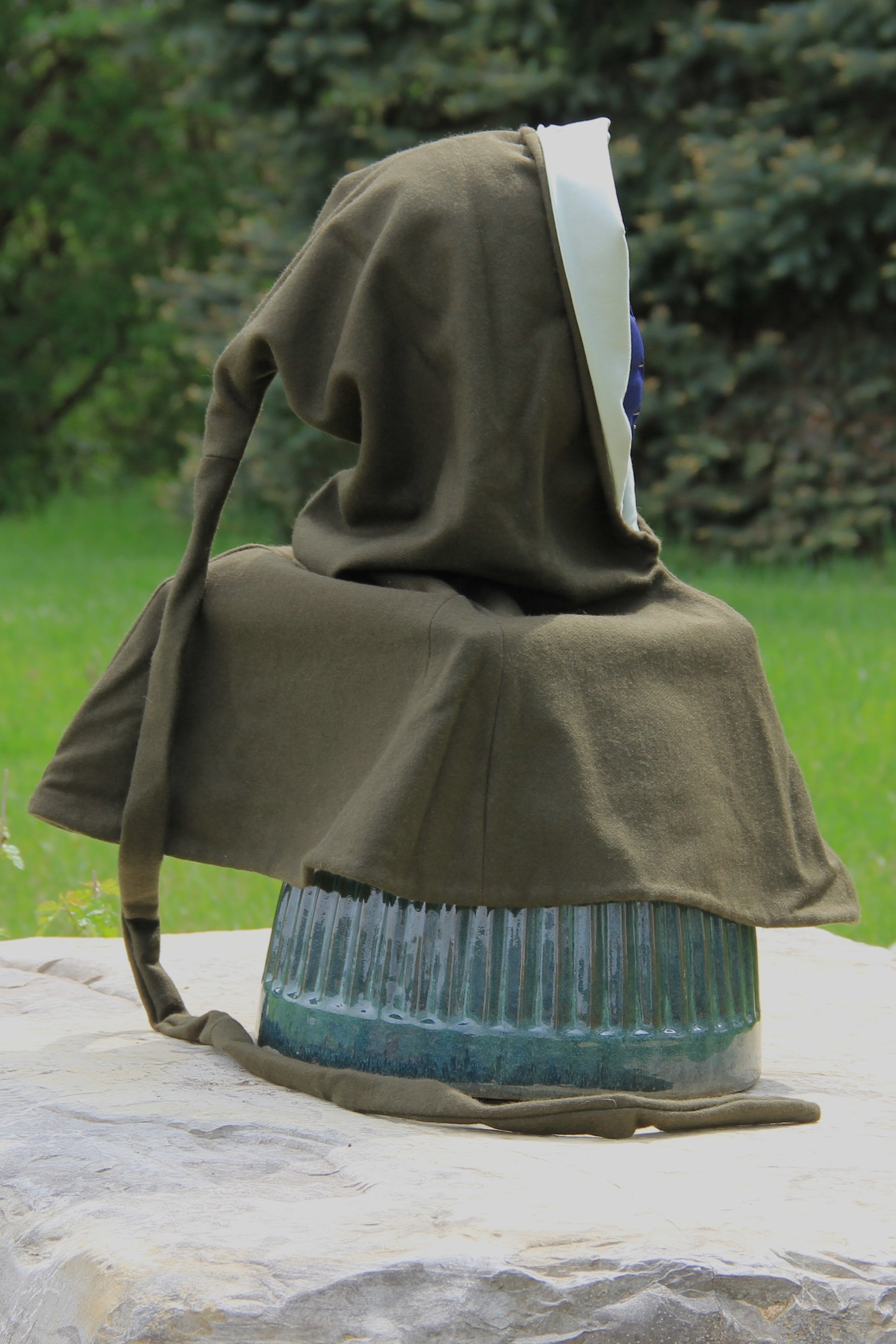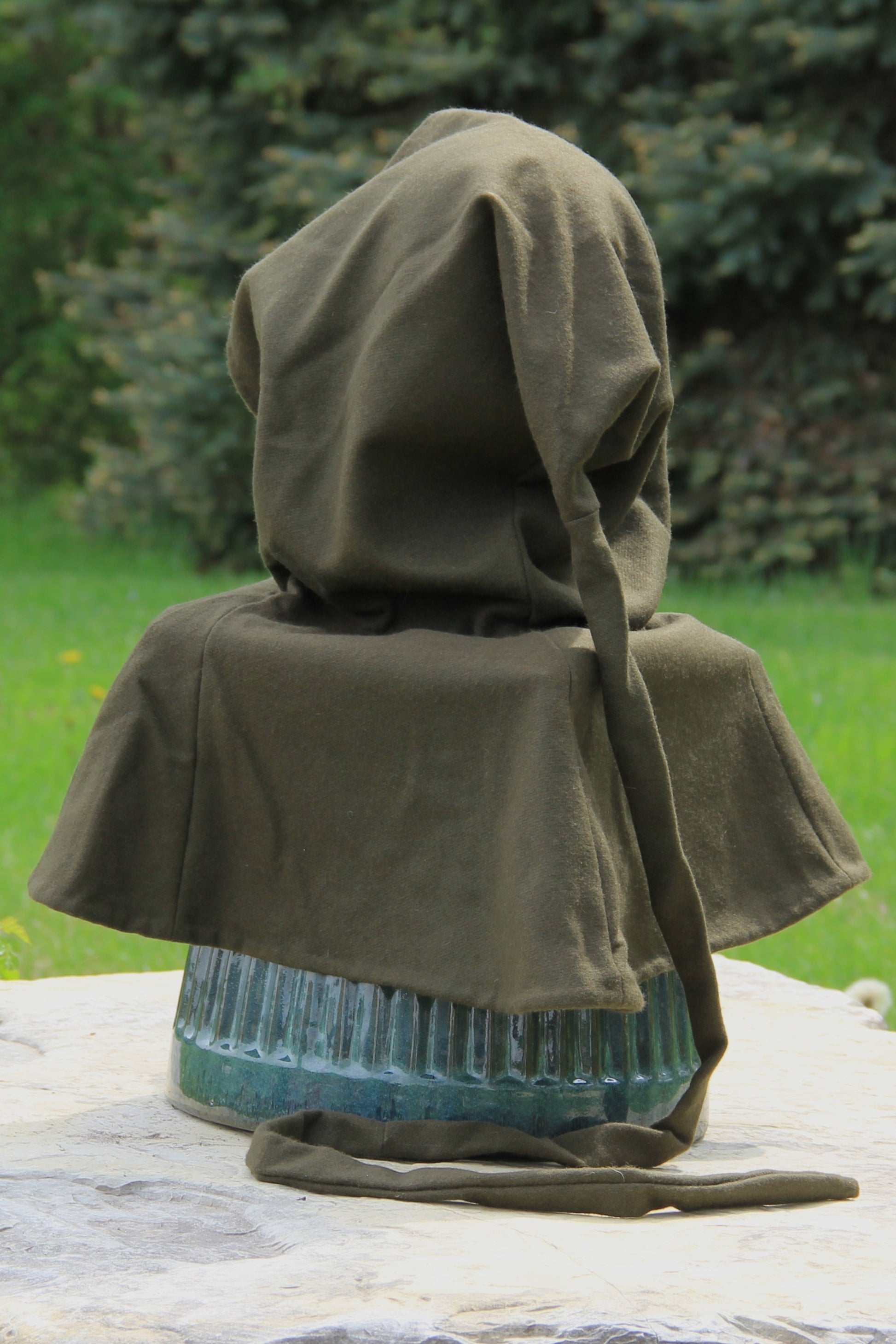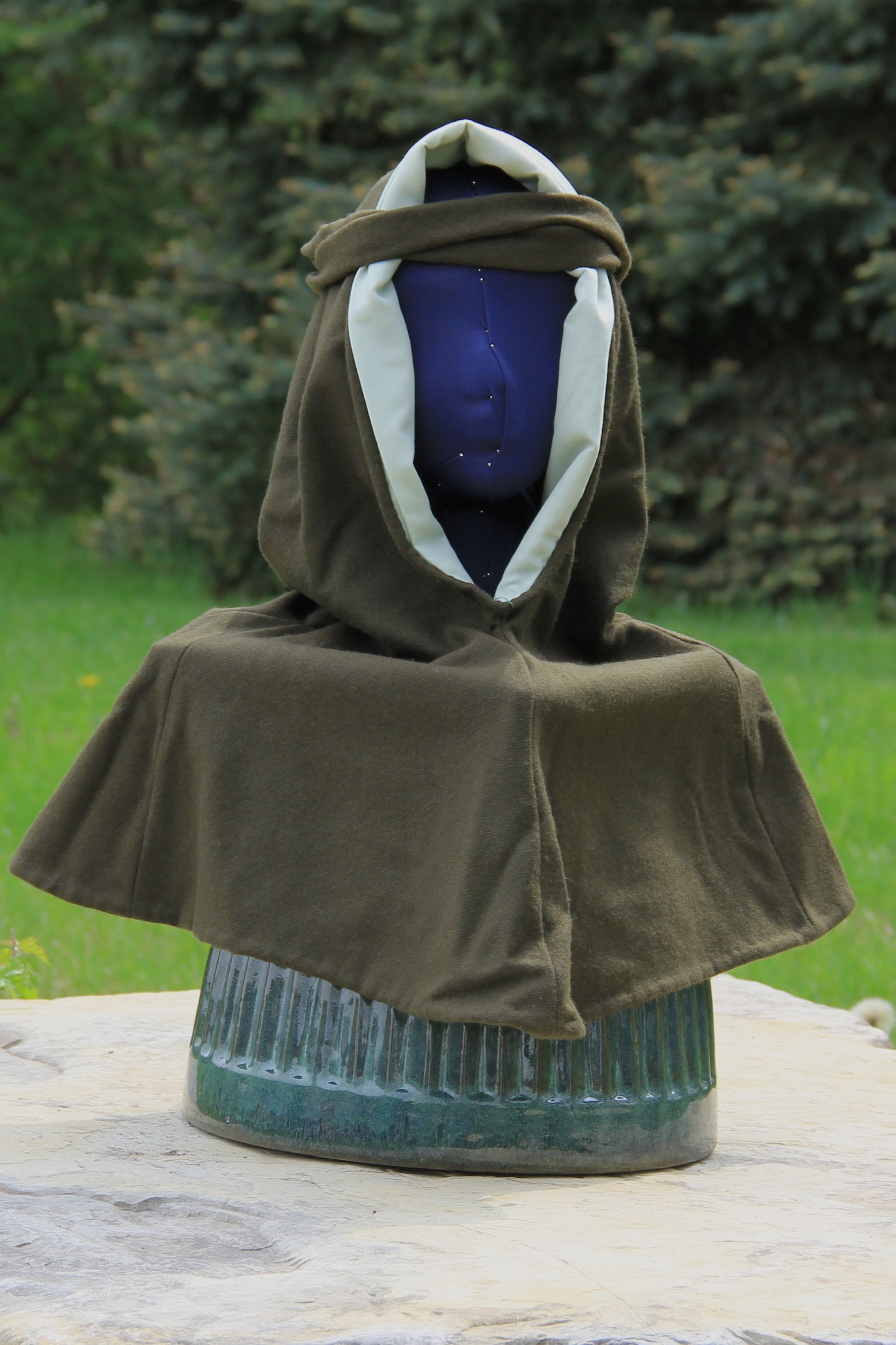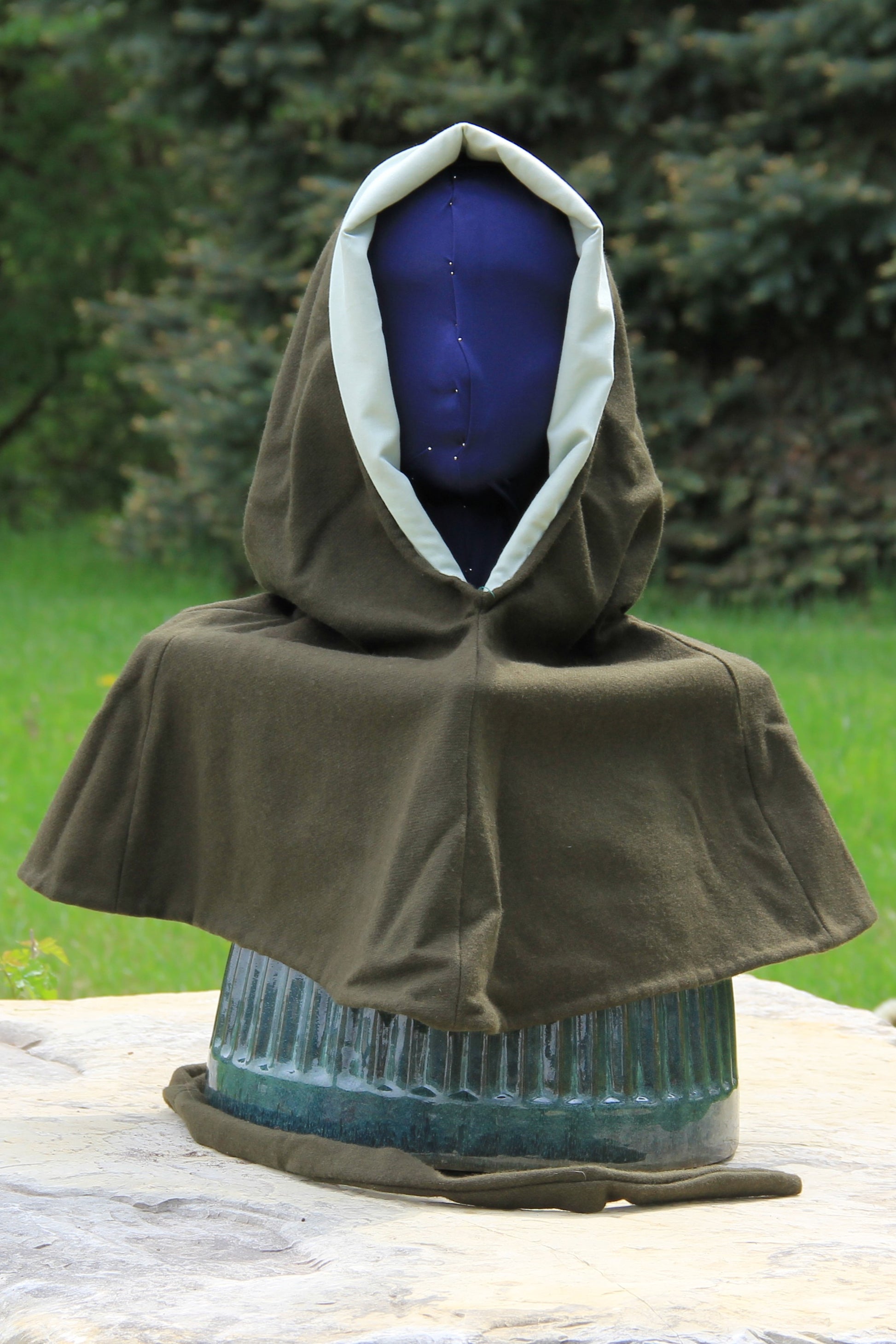 This hood has an army green, 100% wool shell and a sea foam green, 100% cotton lining. The neck is approximately 26" around, which can be comfortably pulled over most people's heads and hair. The liripipe is over 3' long, giving plenty of length for your practical and fashionable needs. The medium weight, dense, wool is a great insulator and breathable. Most dirt can be brushed off the wool with ease between washings, and the cotton lining will hold up to scrubbing, for tough stains. It may be washed in water, but cold is recommended, as wool is prone to warping. and shrinking.