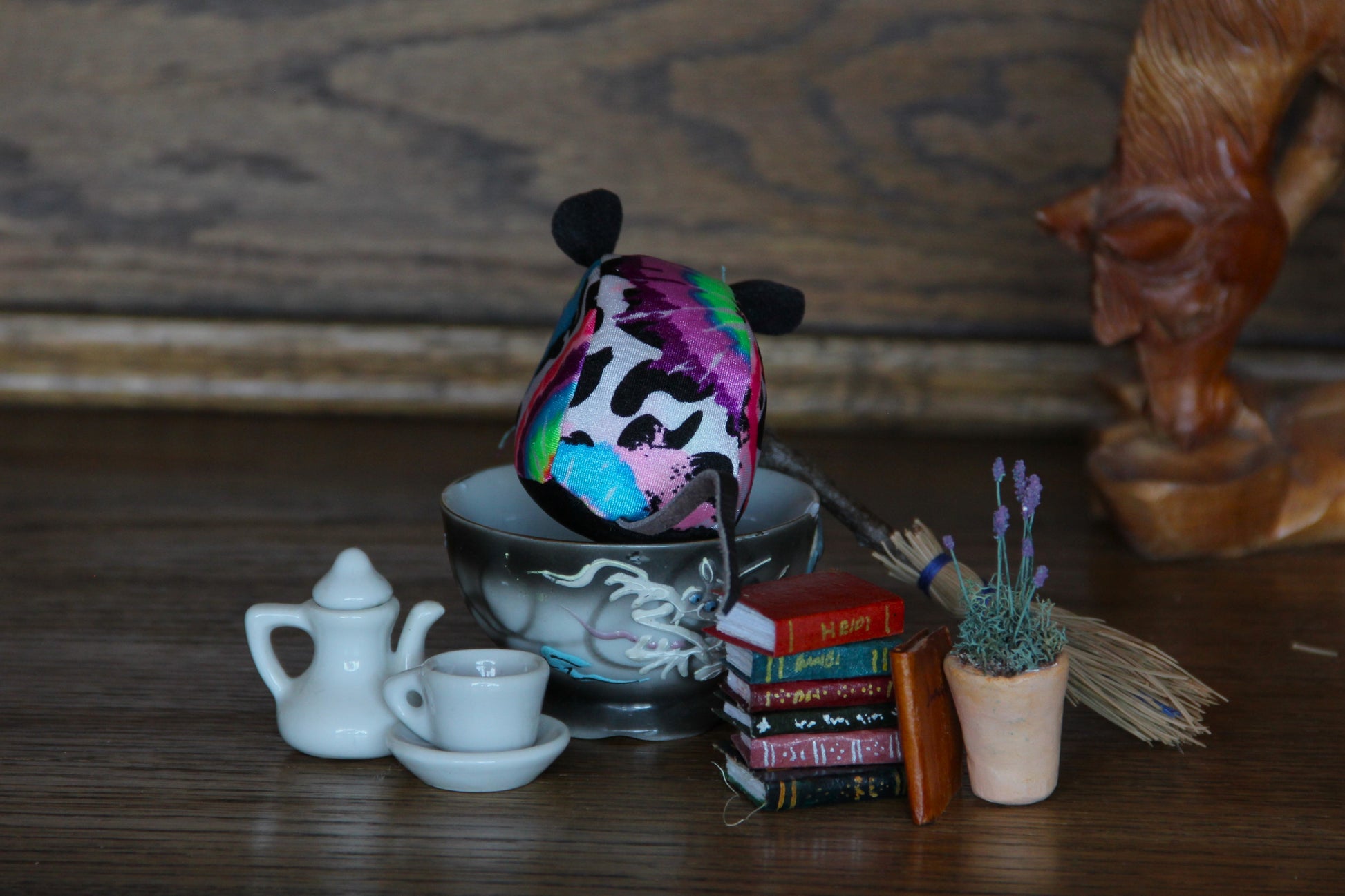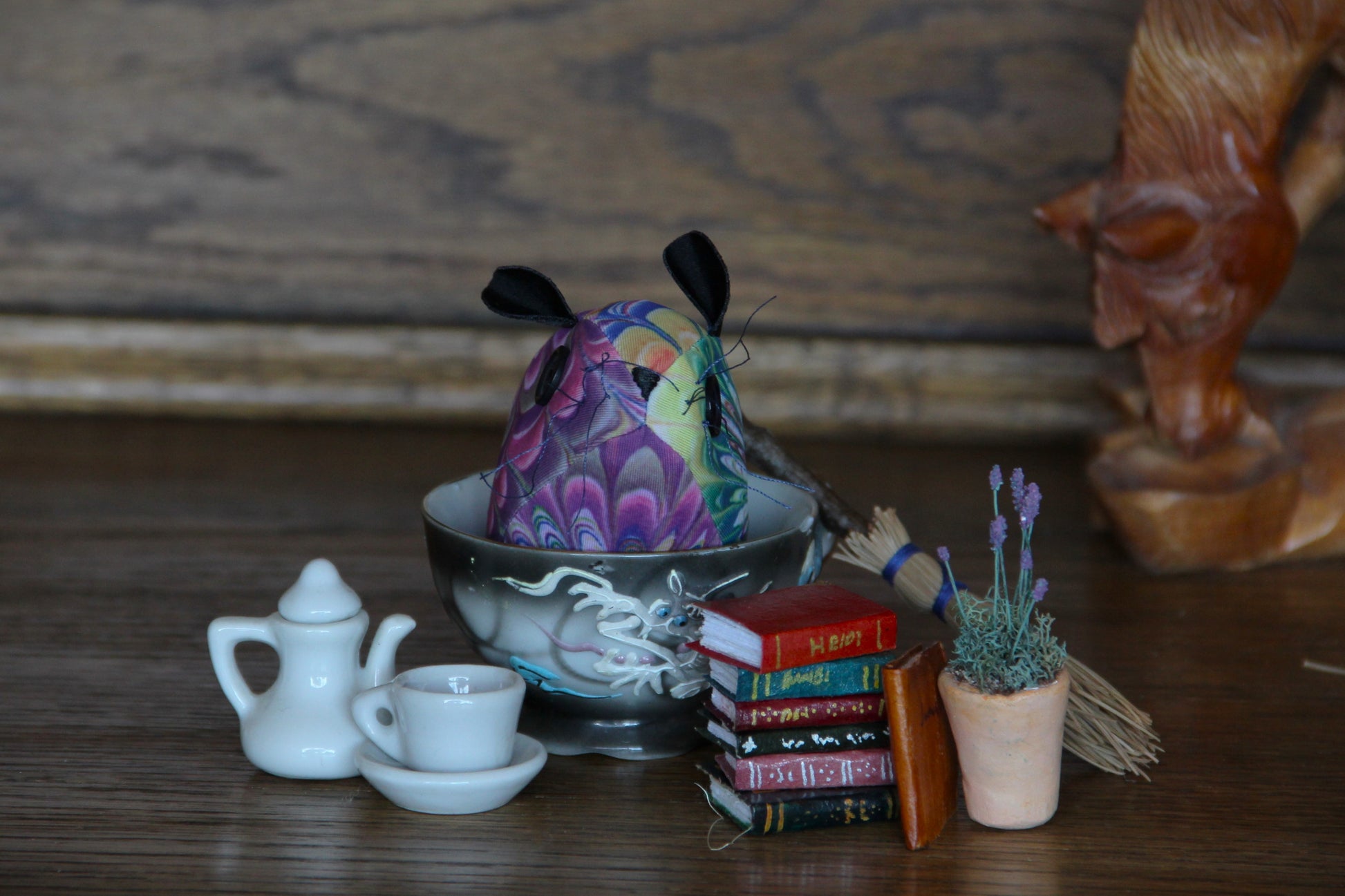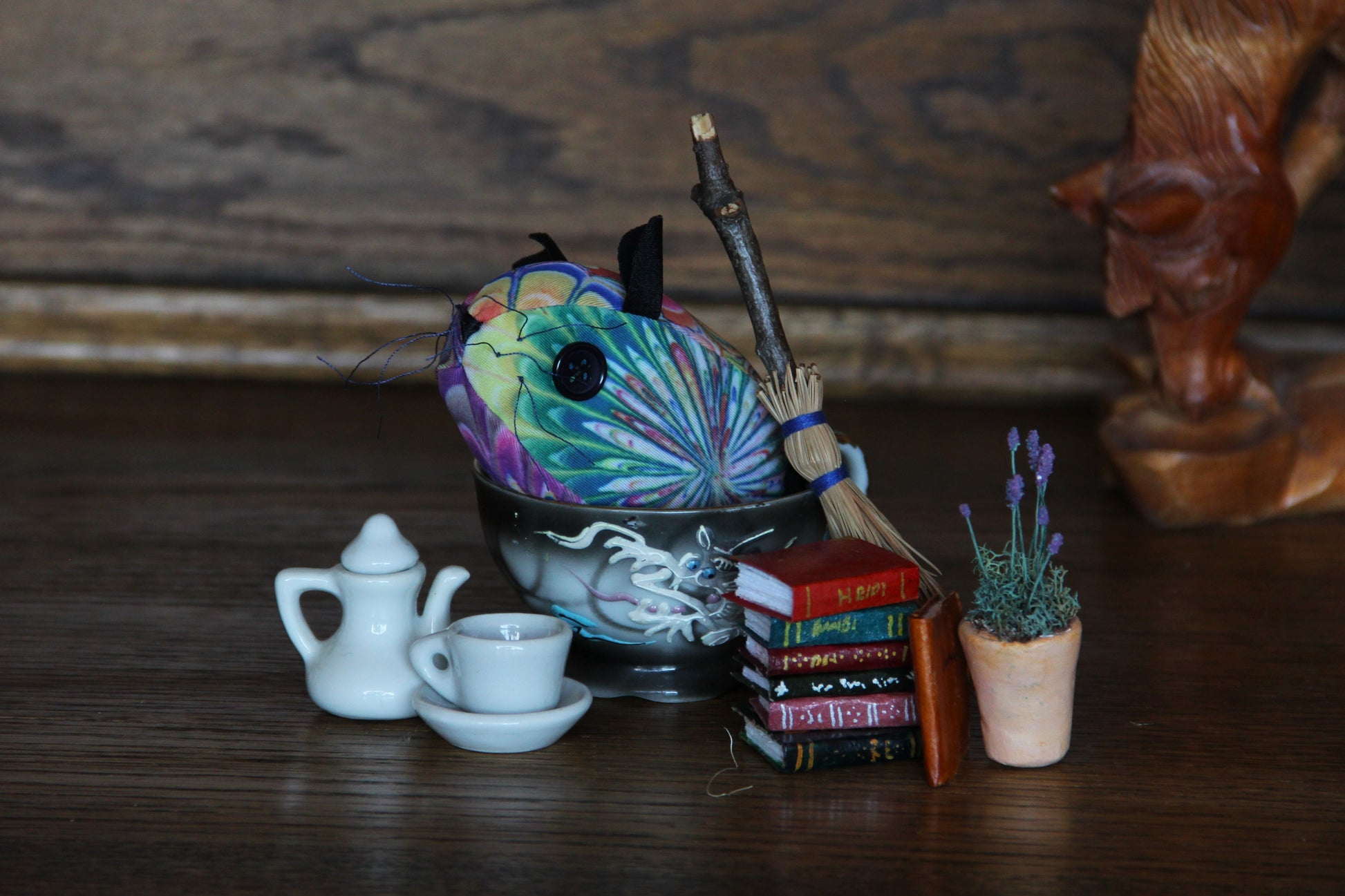 A round, soft companion that fits perfectly in your hand. Very appropriate as a desk pet, pocket sized soft toy, or pincushion. Made with vintage buttons and scrap material from other projects, inside and out, keeping the sewing studio zero waste.
