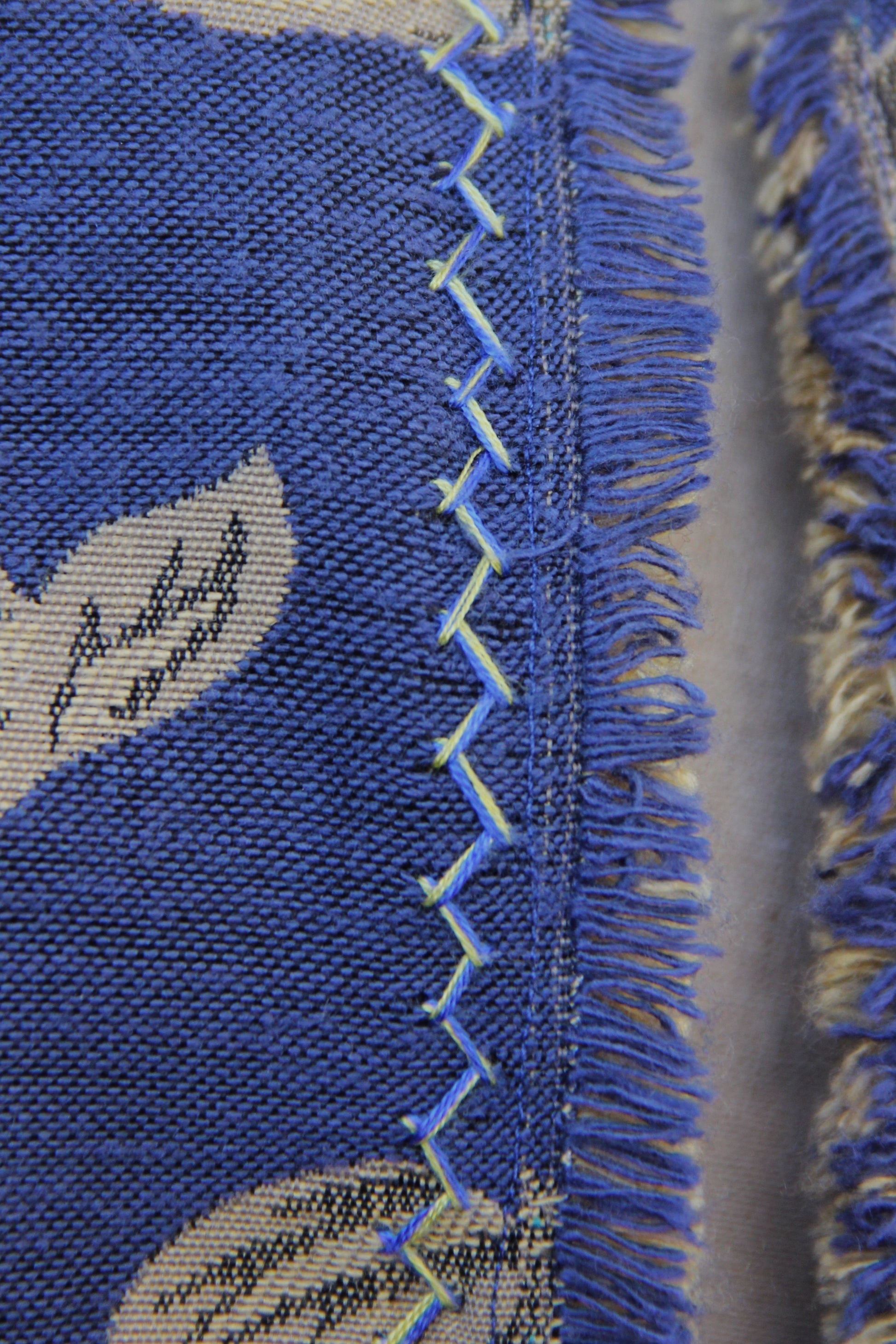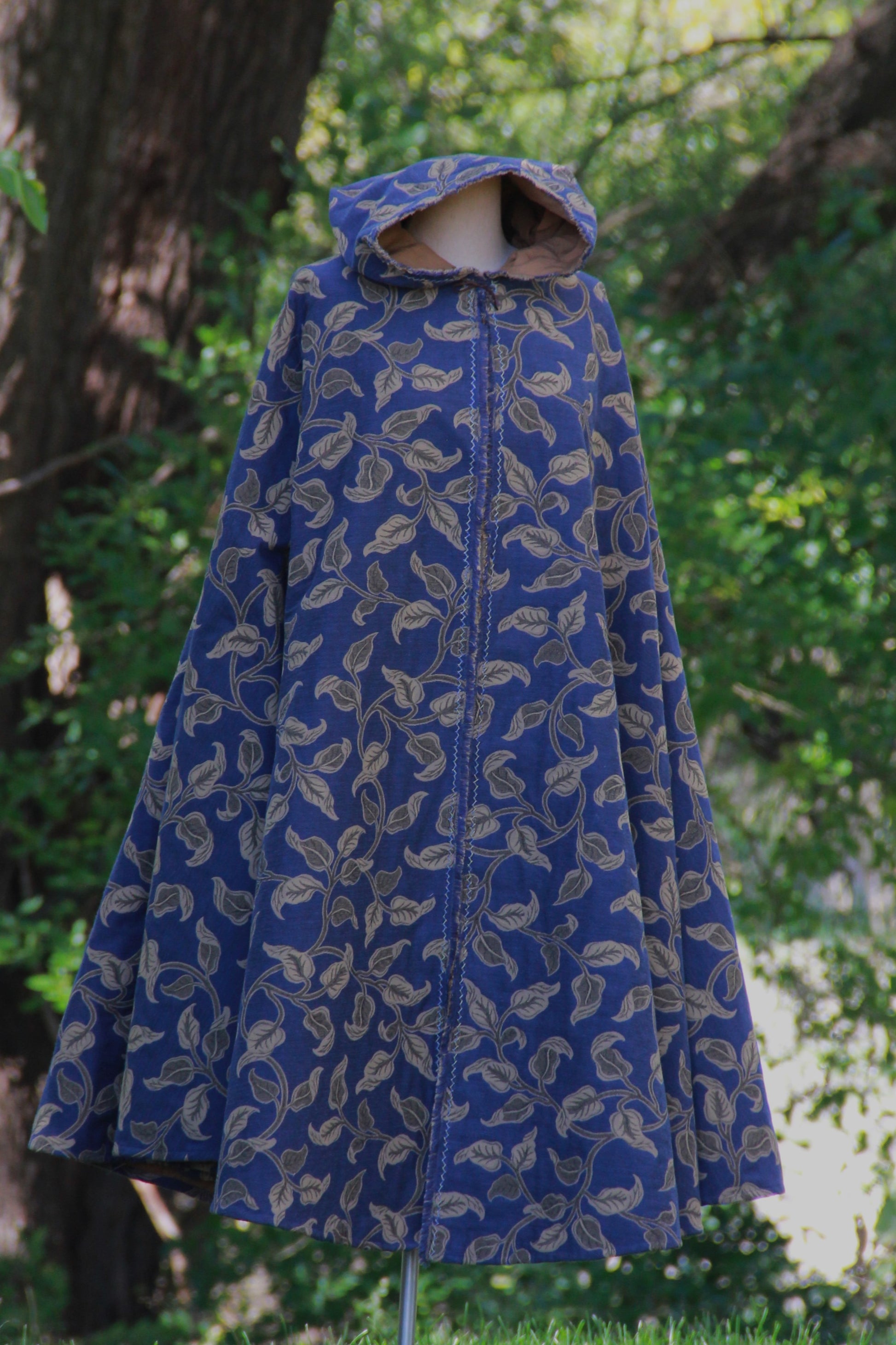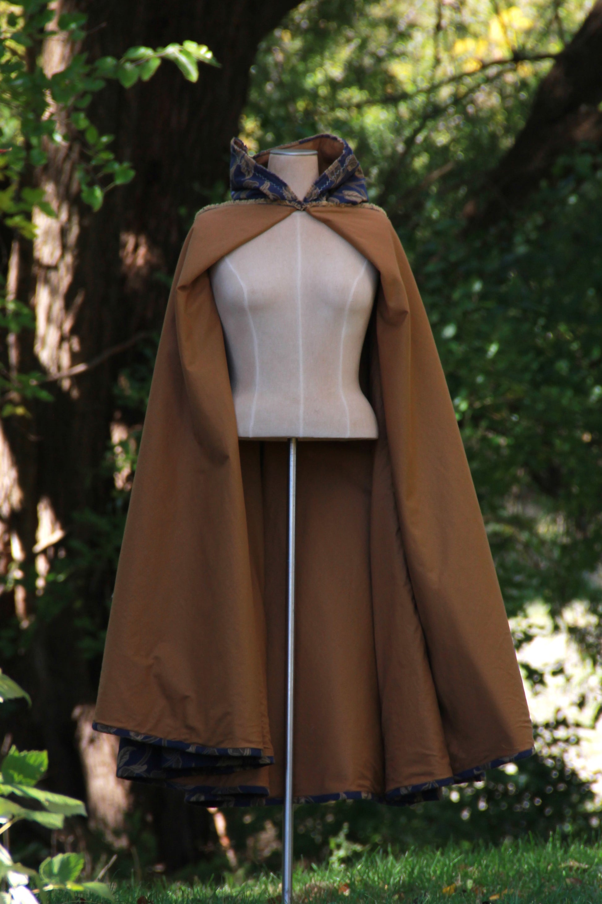 This cloak is a long, sturdy piece of outerwear, balancing practicality and elegance. The fine pattern is made in a thick, hard wearing jacquard with a band of herringbone stitches along the hood and front edges, embroidered by hand. It is lined in a soft, amber cotton for comfort and easy cleaning. It is a full 3/4 circle, laying closed more comfortably than semicircle cloaks, and the large, pleated hood adds extra shelter. The closure is a pair of re-enforced eyelets covered by hand. They are large enough for a sturdy cloak pin or a tie of your choice. A leather tie is included with the cloak.