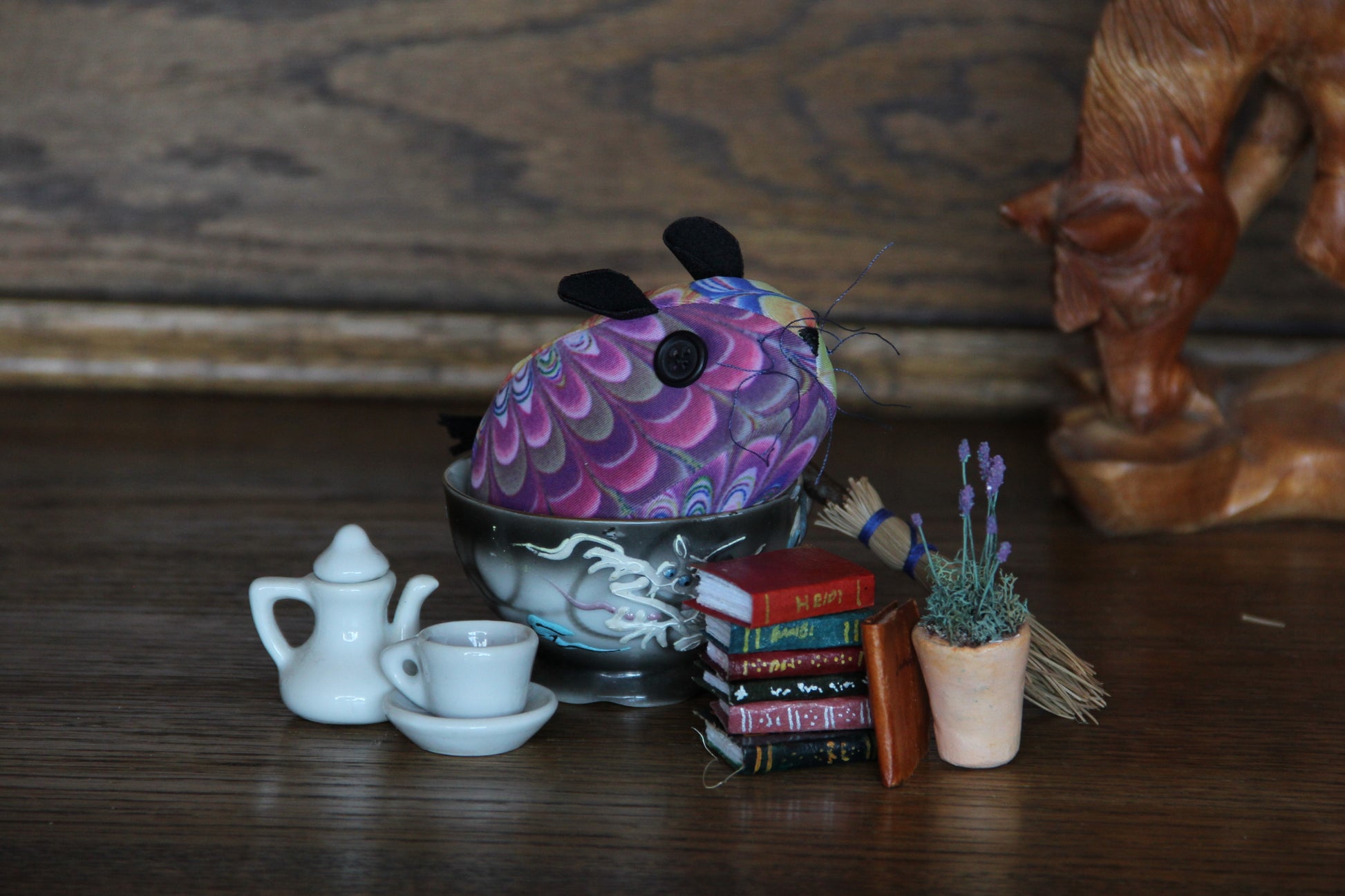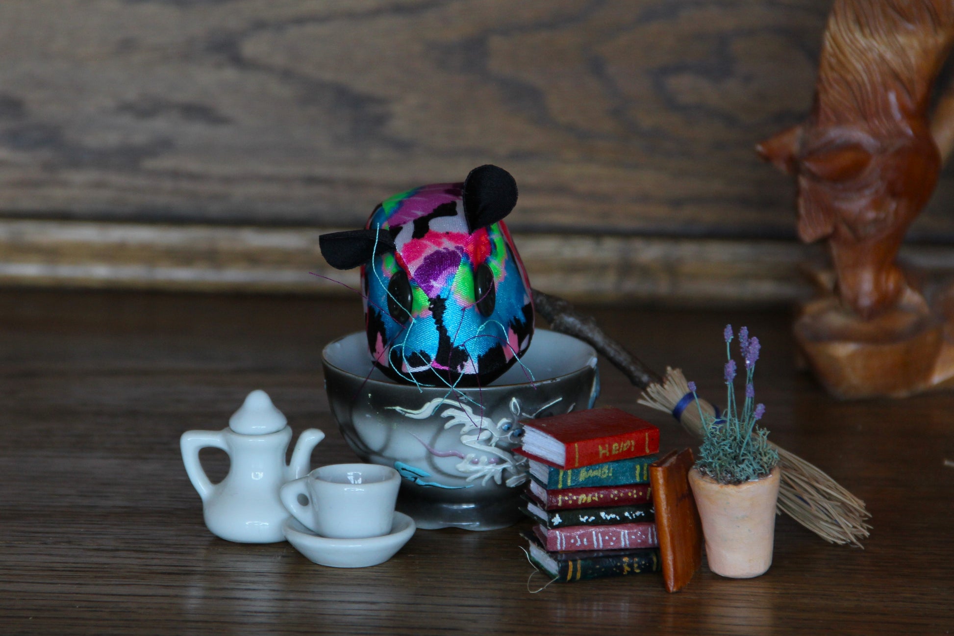 A round, soft companion that fits perfectly in your hand. Very appropriate as a desk pet, pocket sized soft toy, or pincushion. Made with vintage buttons and scrap material from other projects, inside and out, keeping the sewing studio zero waste.