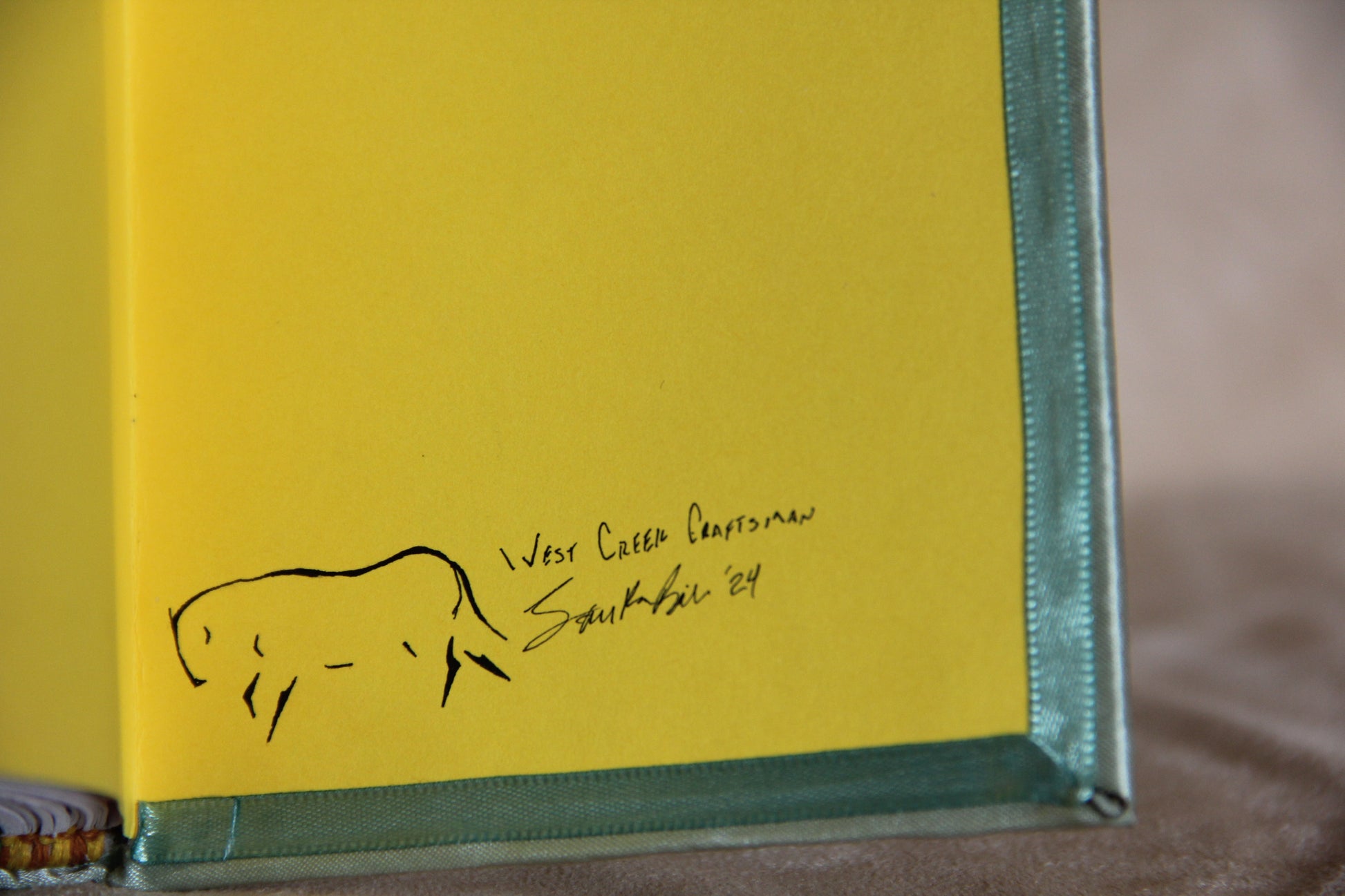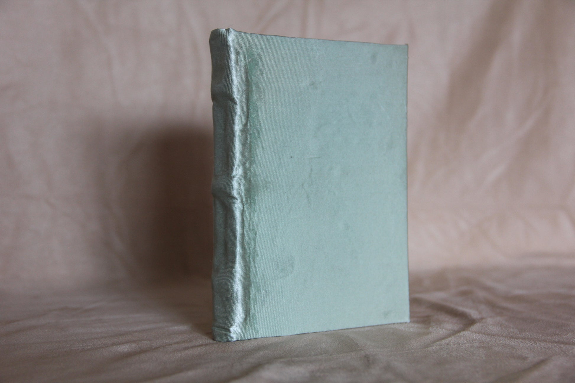 Hardcover, cord bound, in pale green satin, with a hand-woven bookmark for convince. This book contains 50 blank pages of calligraphy paper that are approximately 4x6". Perfect for a journal or small sketchbook.