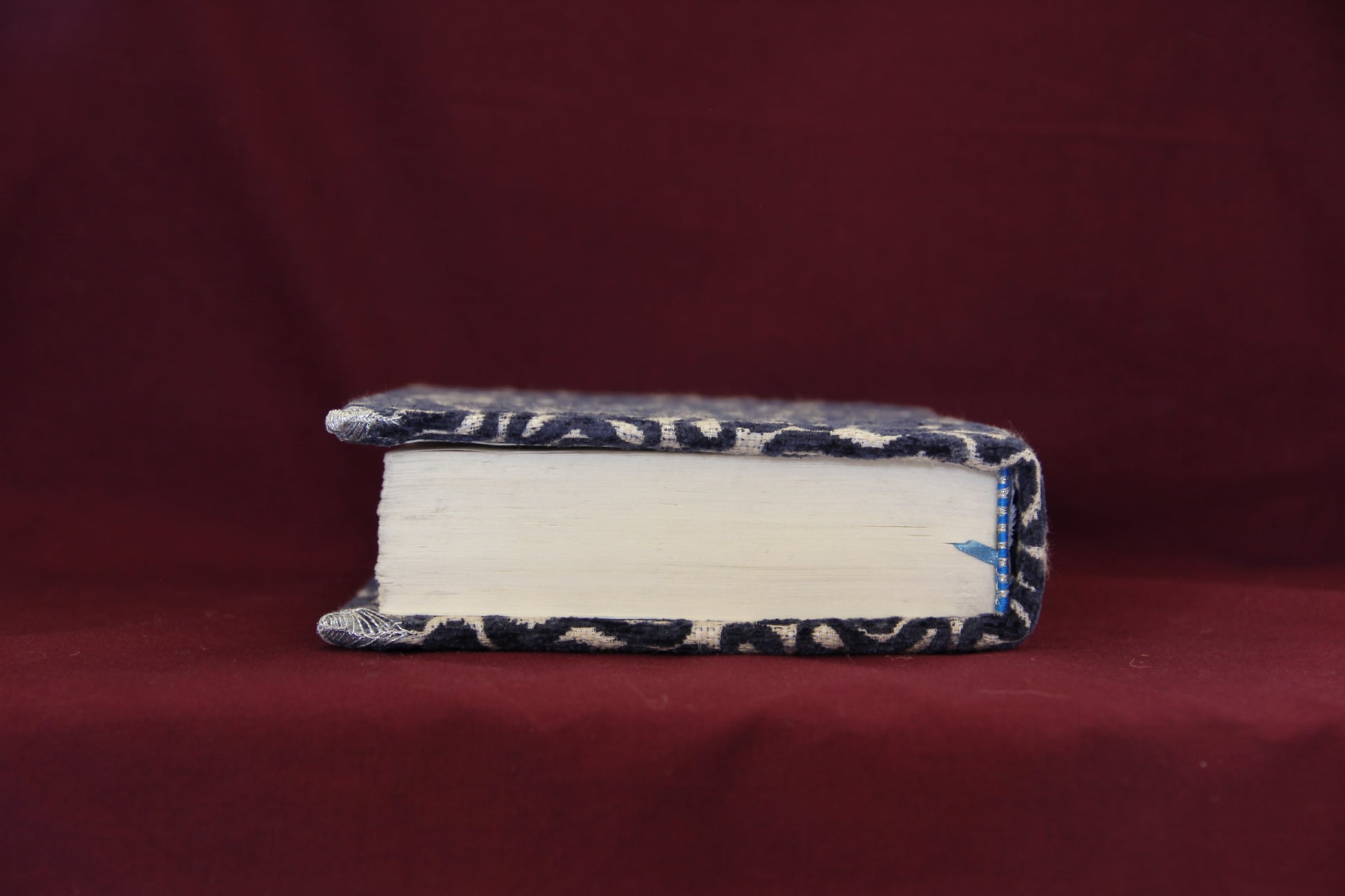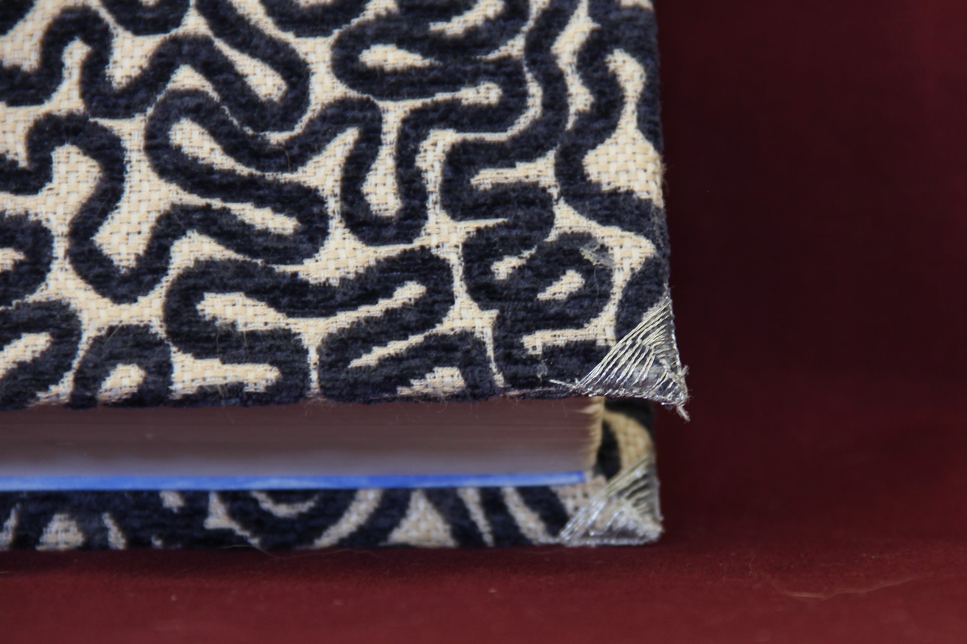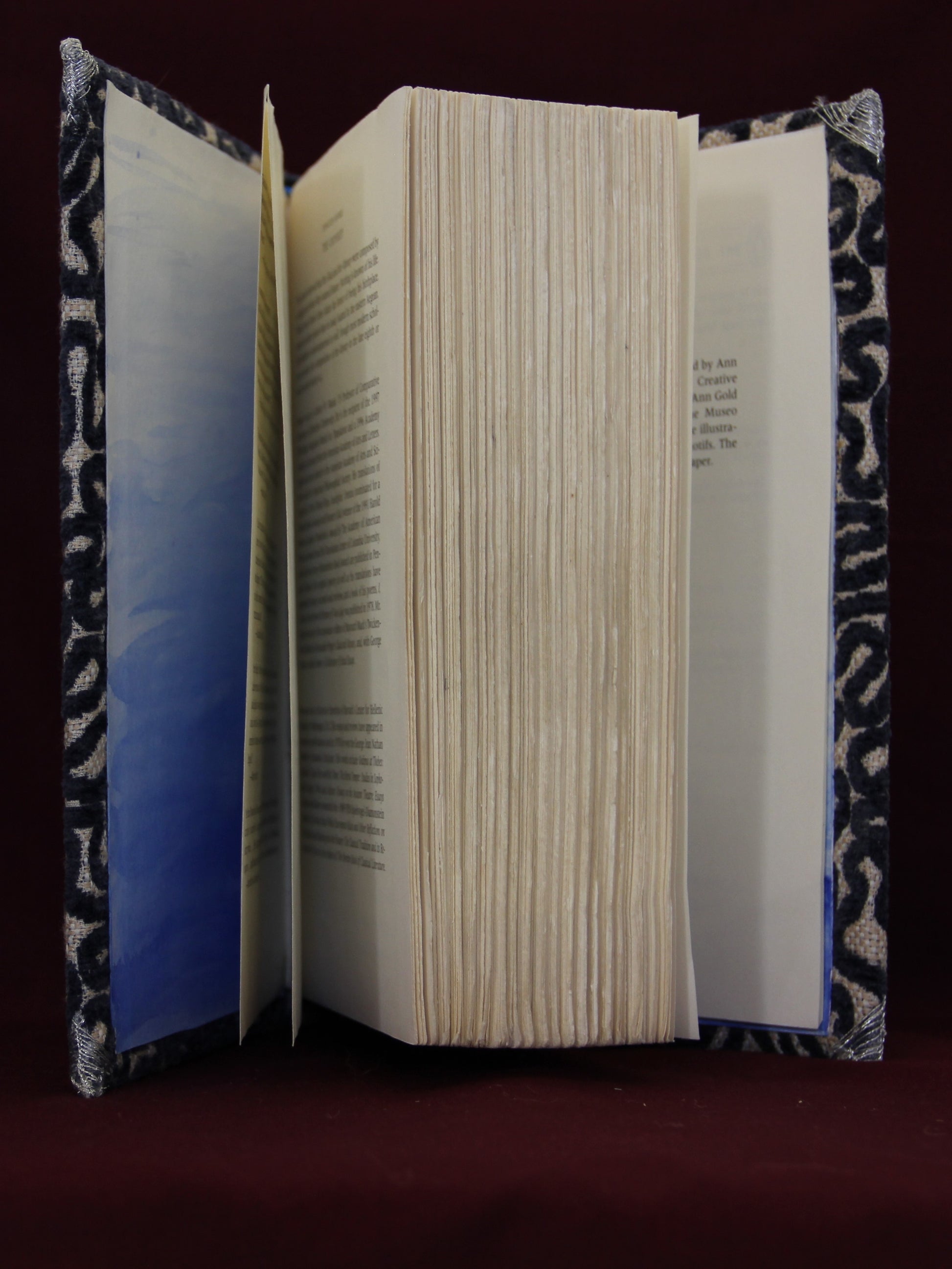 This book has been rebound into a hardcover, and finished in a bold burnout velvet. It is cord bound with hand stitched headbands and corner protectors. The text block is in very good condition, save witty notes penciled in by its previous owner. Lovers of literature looking for a unique and quality addition to their bookshelf should be well satisfied by this covering. Books like the Oddessy are overprinted, and recovered books like this one give the experience of a luxury copy while saving a less expensive book from the landfill.